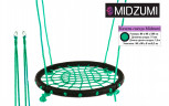 Качели-гнездо Midzumi выполнены из металлической рамы диаметром 60 сантиметров, с дополнительной защитной оплеткой ее бортиков, обтянутых прочным синтетическим канатом толщиной 10 мм выдерживающим нагрузку 100 кг. Плетеное синтетическое сидение качелей удобное и практичное, не собирает грязь и воду, при сильных загрязнениях его можно протереть.